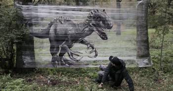 Artista pinta animales con spray sobre plástico en el bosque - lucen super re..