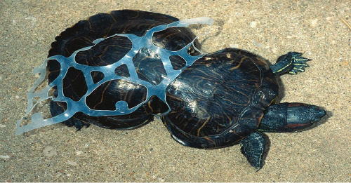 Deformación del caparazón de un tortuga por plástico.