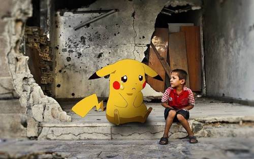Hay una gran cantidad de Pokémon en Siria, ven y sálvame", algunos mensajes que los niños sostienen.