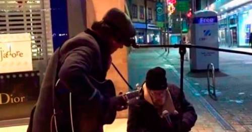 Músico callejero accede para que un vagabundo cante con él, su voz impacta a los transeúntes