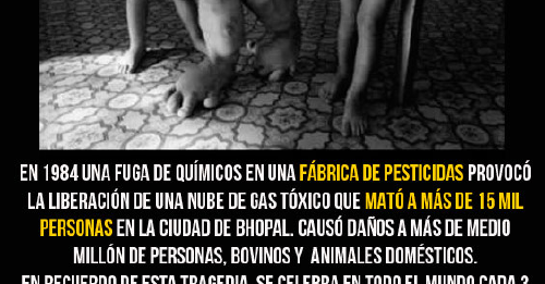 En una fábrica de pesticidas en la ciudad de Bhopal en el año 1984, se produjo una fuga significativa de químicos, lo cual formó una nube de gas tóxico quitándole la vida a más de quince mil personas. También causo daños a animales domésticos y bovinos, y más de medio millón de personas se vieron afectadas. El Día Mundial del No Uso de Plaguicidas, se celebra el 3 de diciembre en recuerdo a esta terrible tragedia.